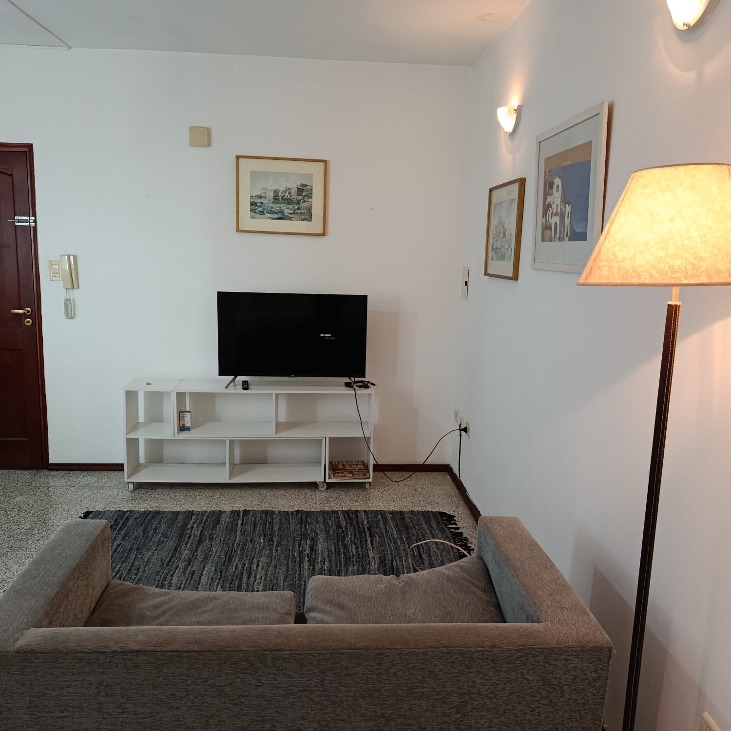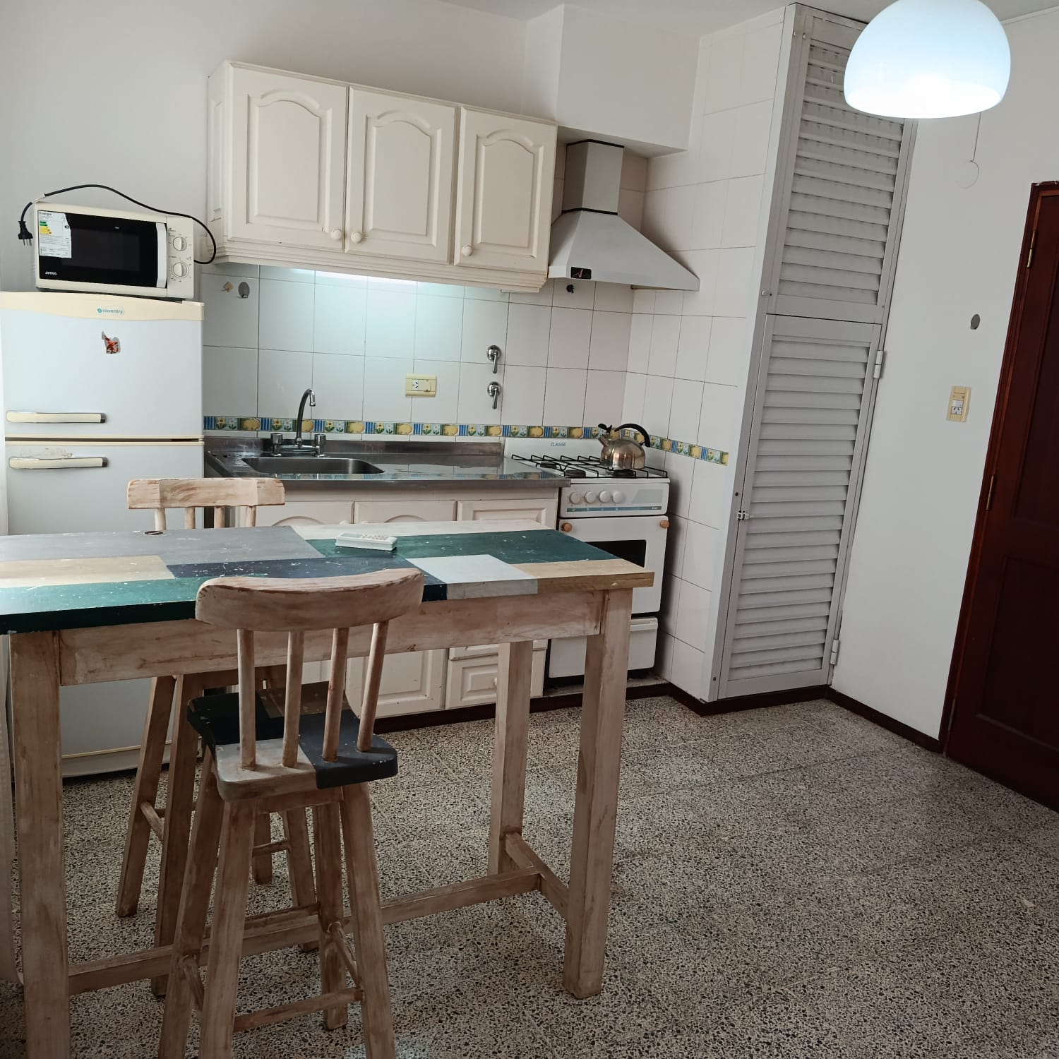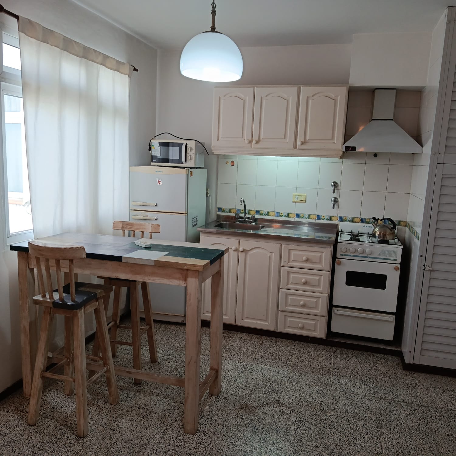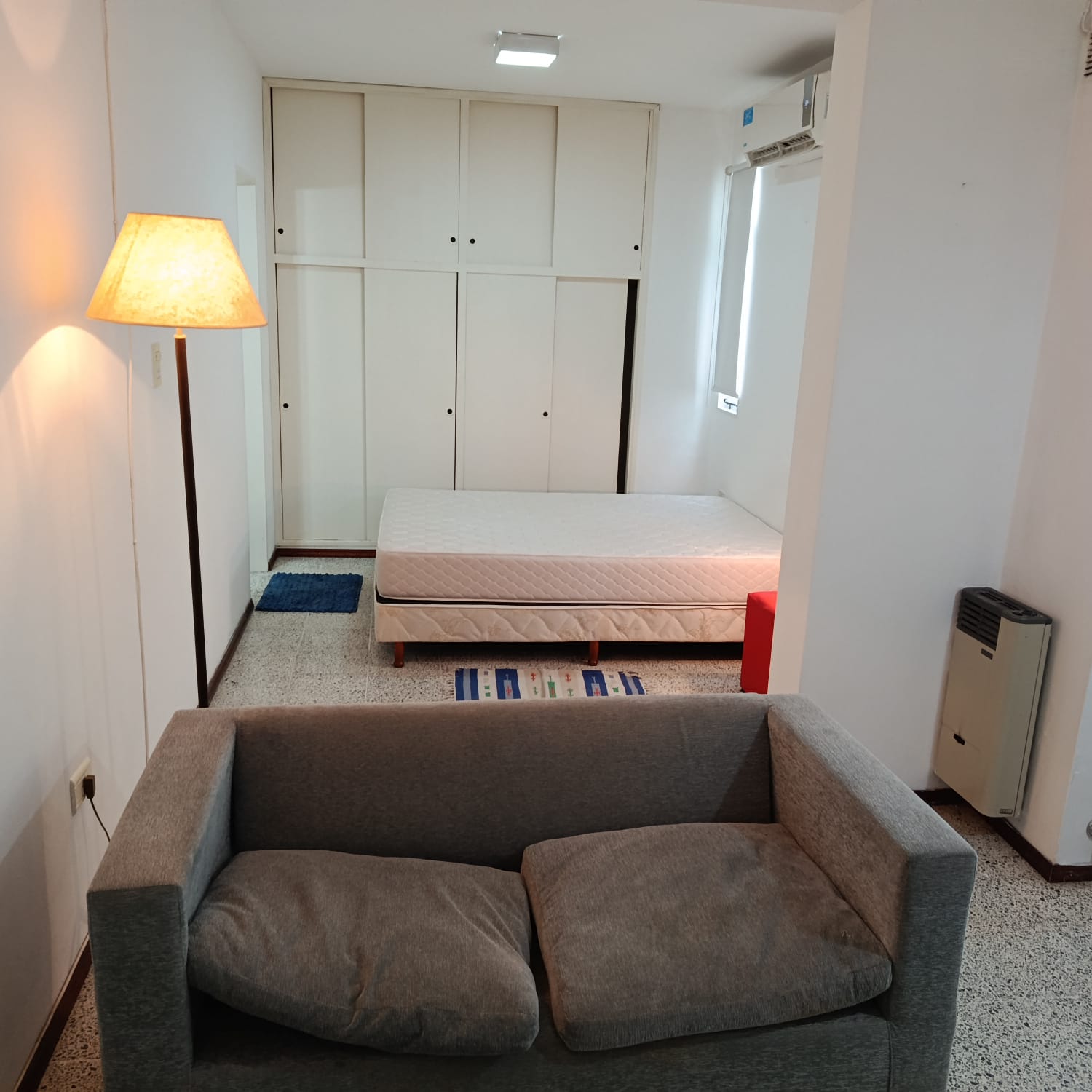 Amplio monoambiente amueblado: Placar, cama, mesada, alacena, cocina, calefactor, campana, mesa sillas, aire acondicionado, TV, sillón. Agua caliente, gas natural, baño. Muy lindo