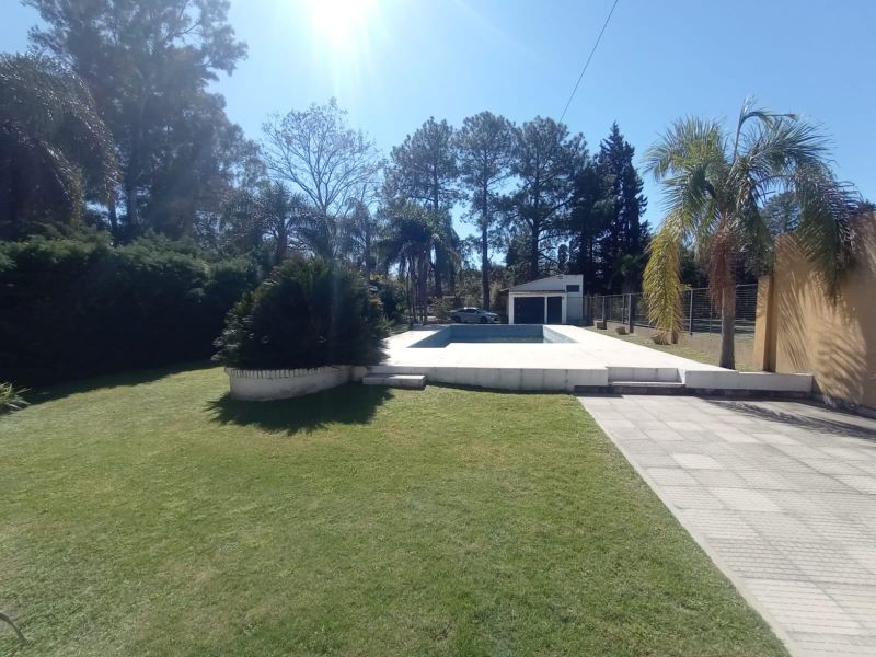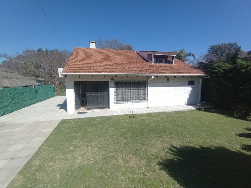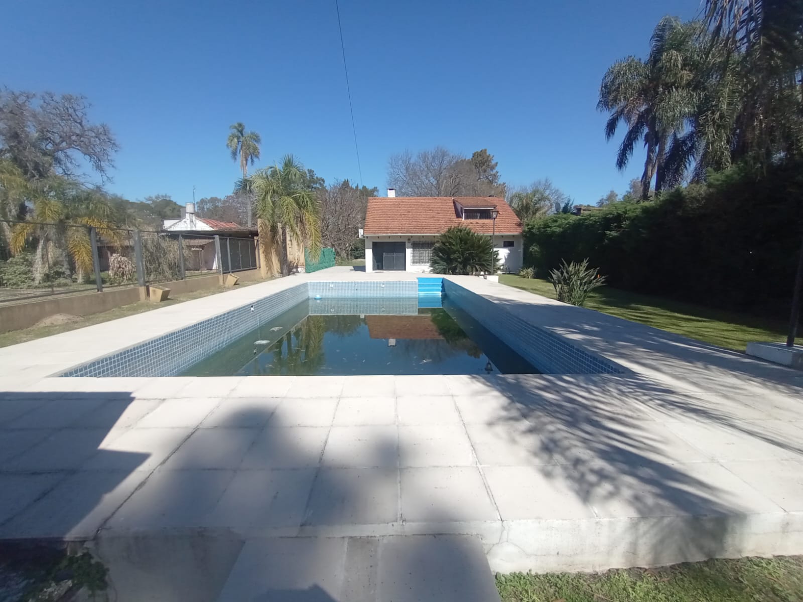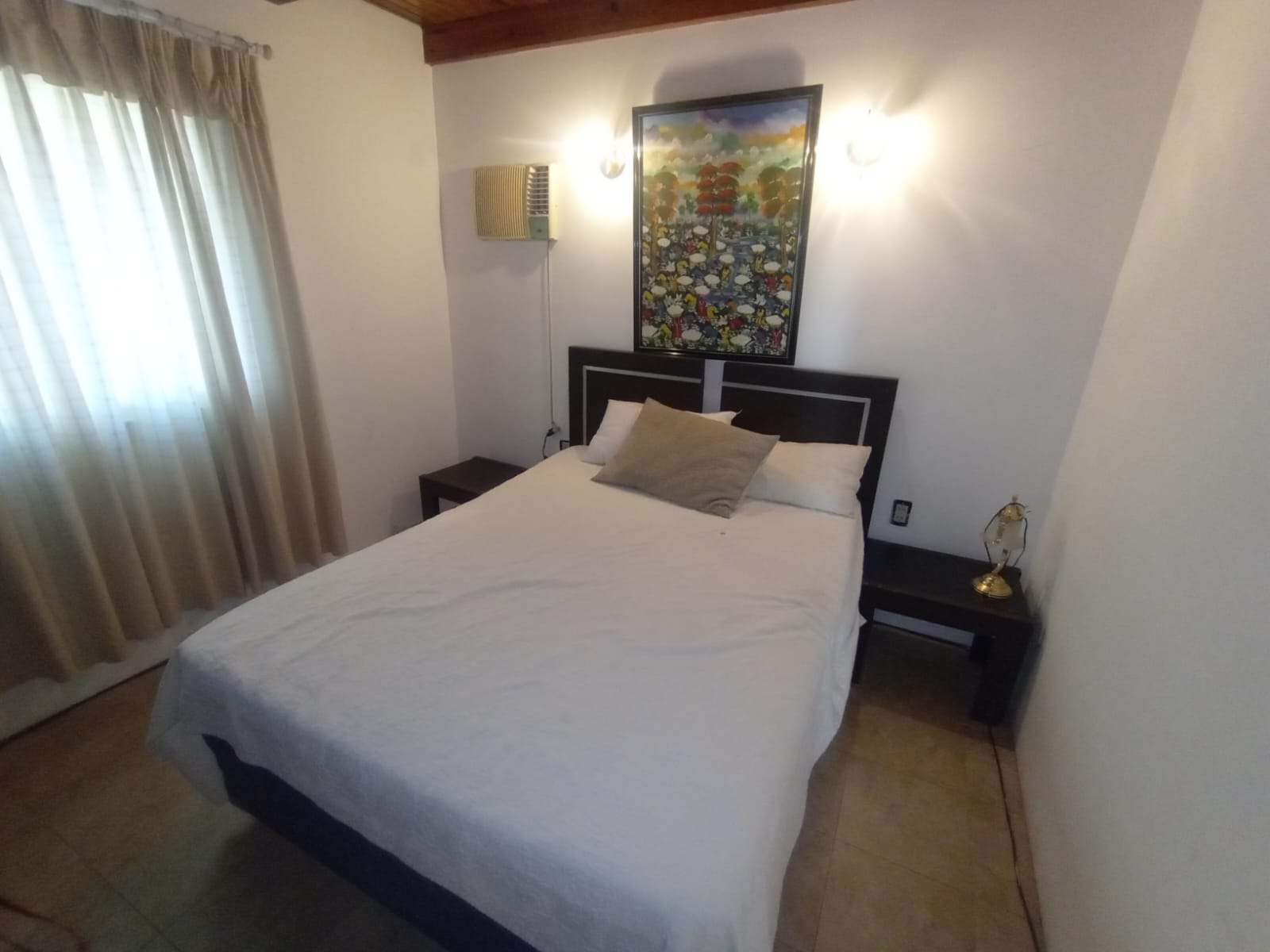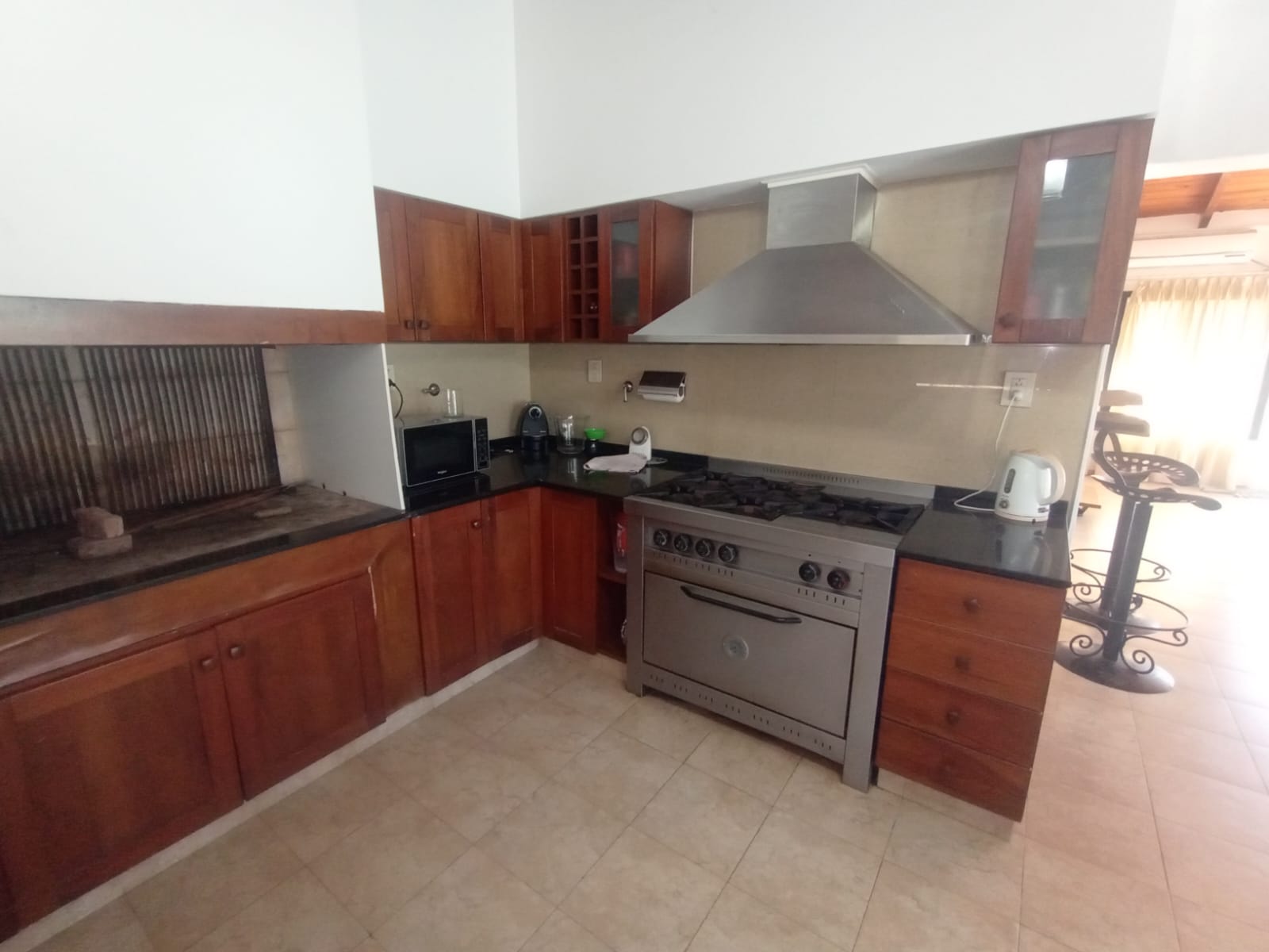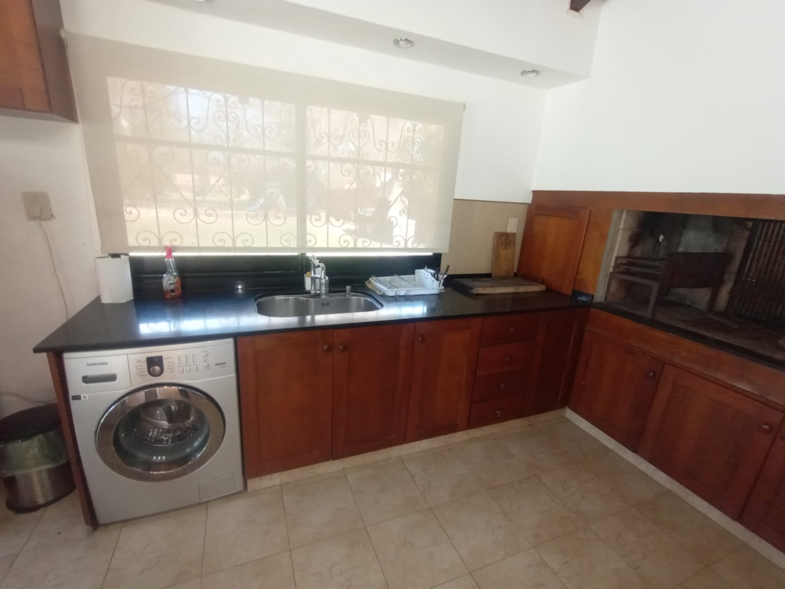 Muy linda propiedad sobre gran terreno que va de calle a calle: 2 dormitorios con placard, aire acond., ventiladores de techo, amplio living-comedor con techos altos, luminoso y ventilado, con juego de living, de comedor, aire acond., ventilador, hogar, baño, cocina-comedor amueblada, mesada, alacenas, cocina industrial, aire acond,. lavarropas, asador. Patio parquizado, con asador, horno de barro, gran pileta de natación con solarium, baño de servicio, lavadero.