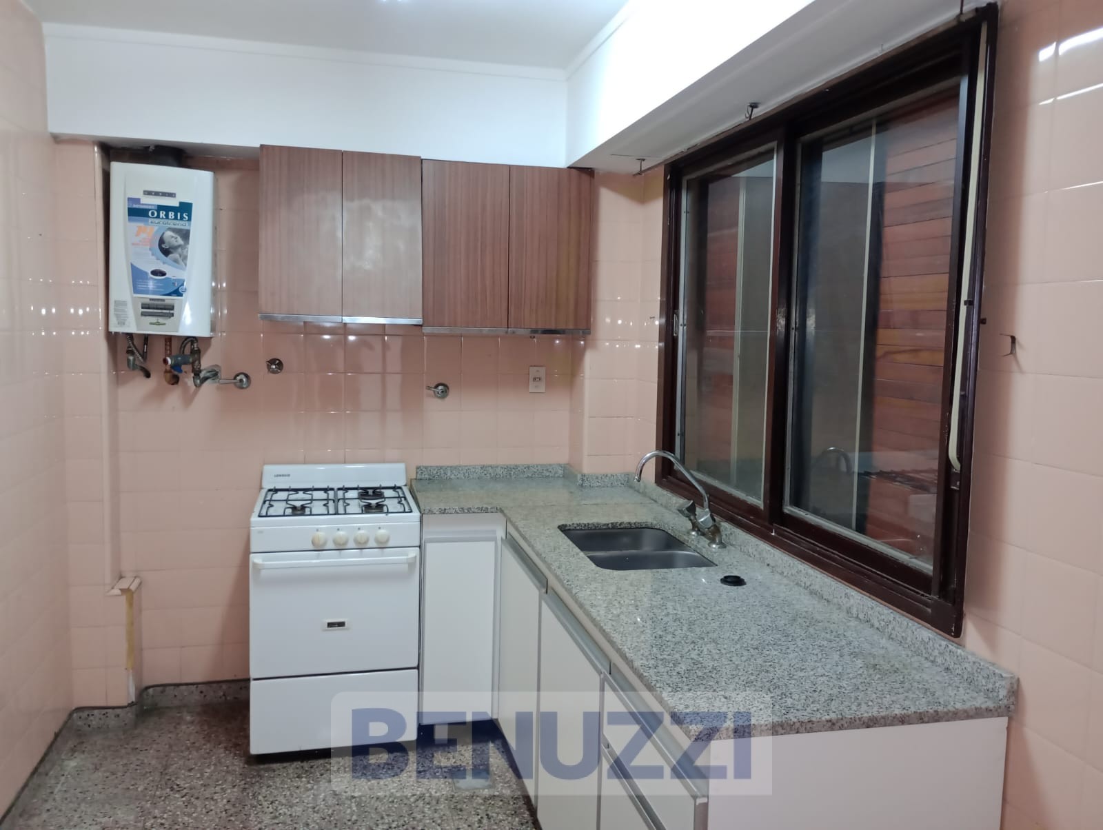 Cocina funcional equipada con mesada, alacenas, artefacto de cocina y calefón. Cuenta con agua caliente y conexión a gas natural.