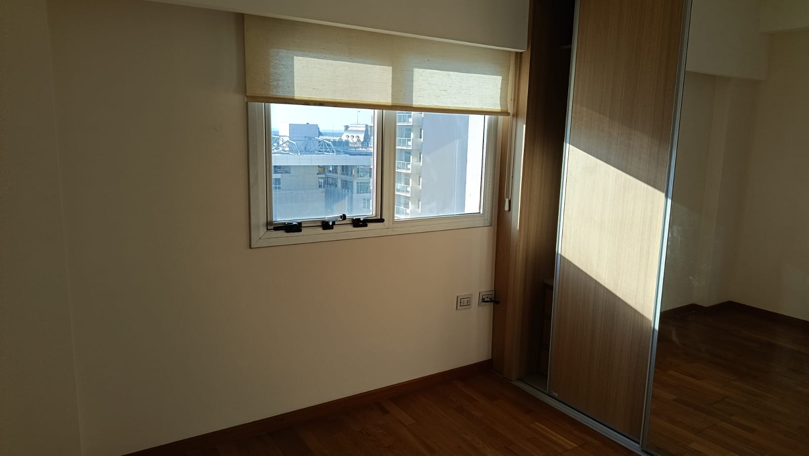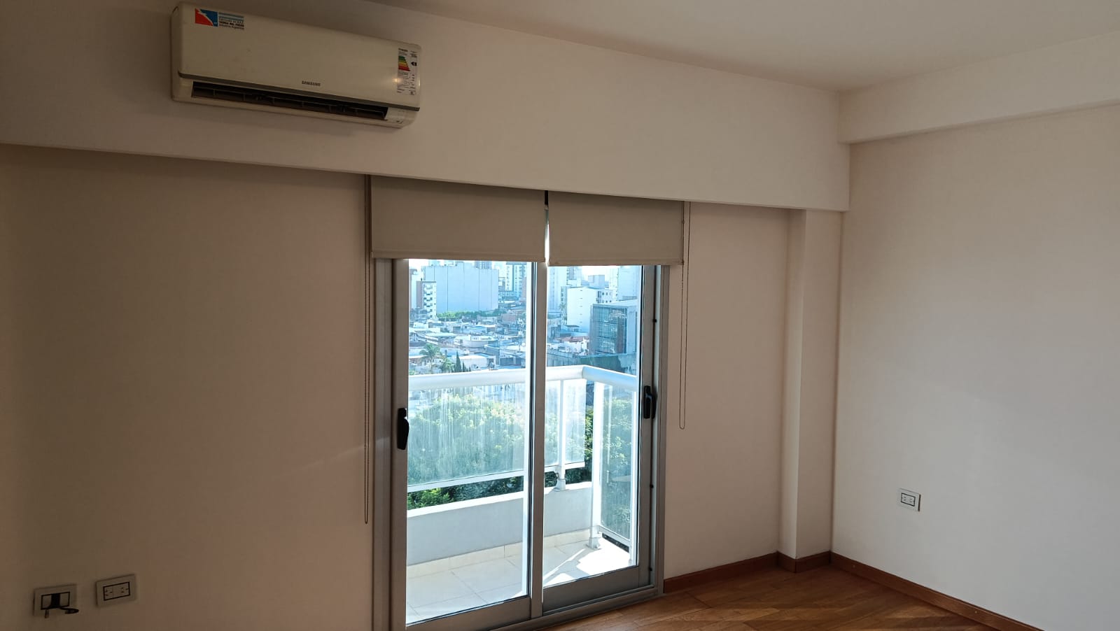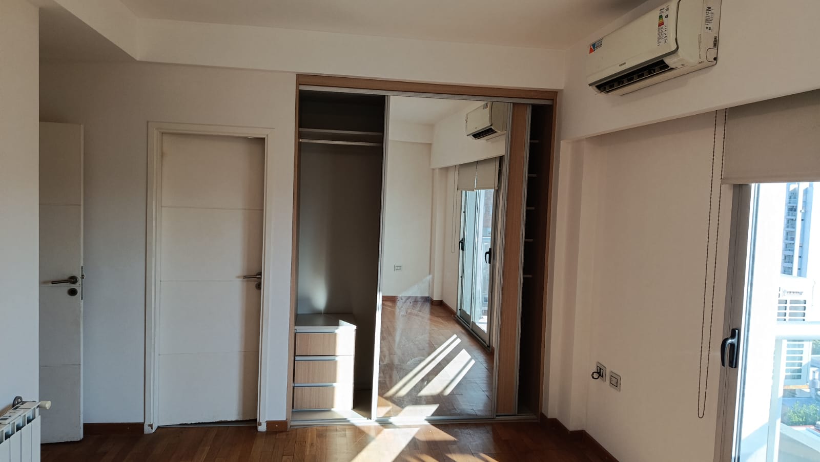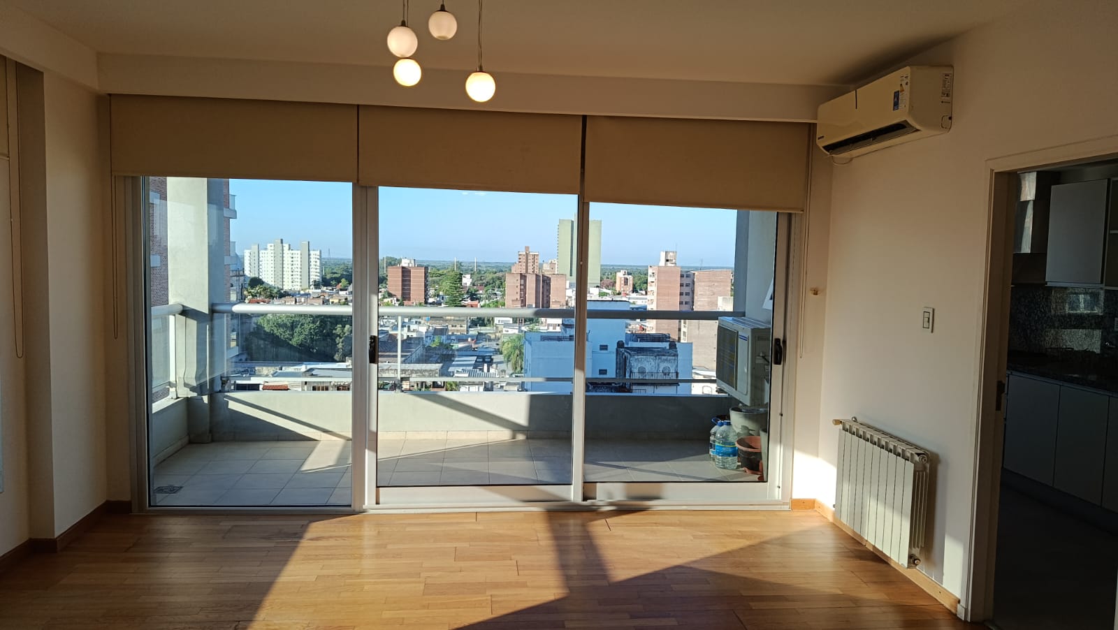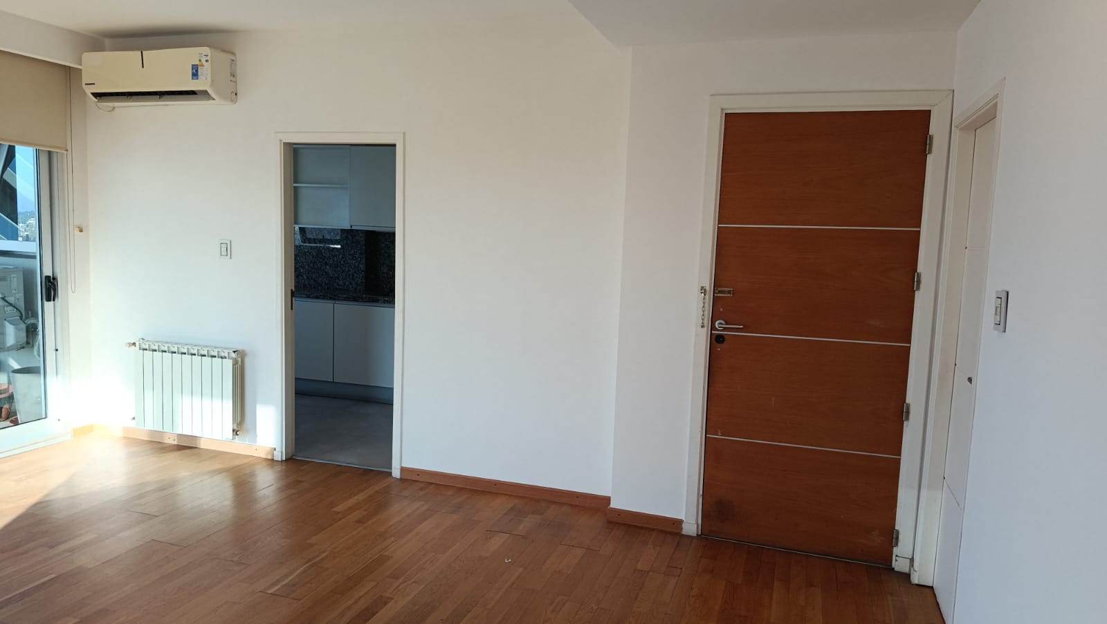 2 dormitorios con placard, (uno en suite) pisos flotantes, uno con acond, cortinas, living-comedor con aire acond, radiadores, cortinas, con balcón al frente, cocina con mesada, alacenas, horno, anafe, 2 baños.
