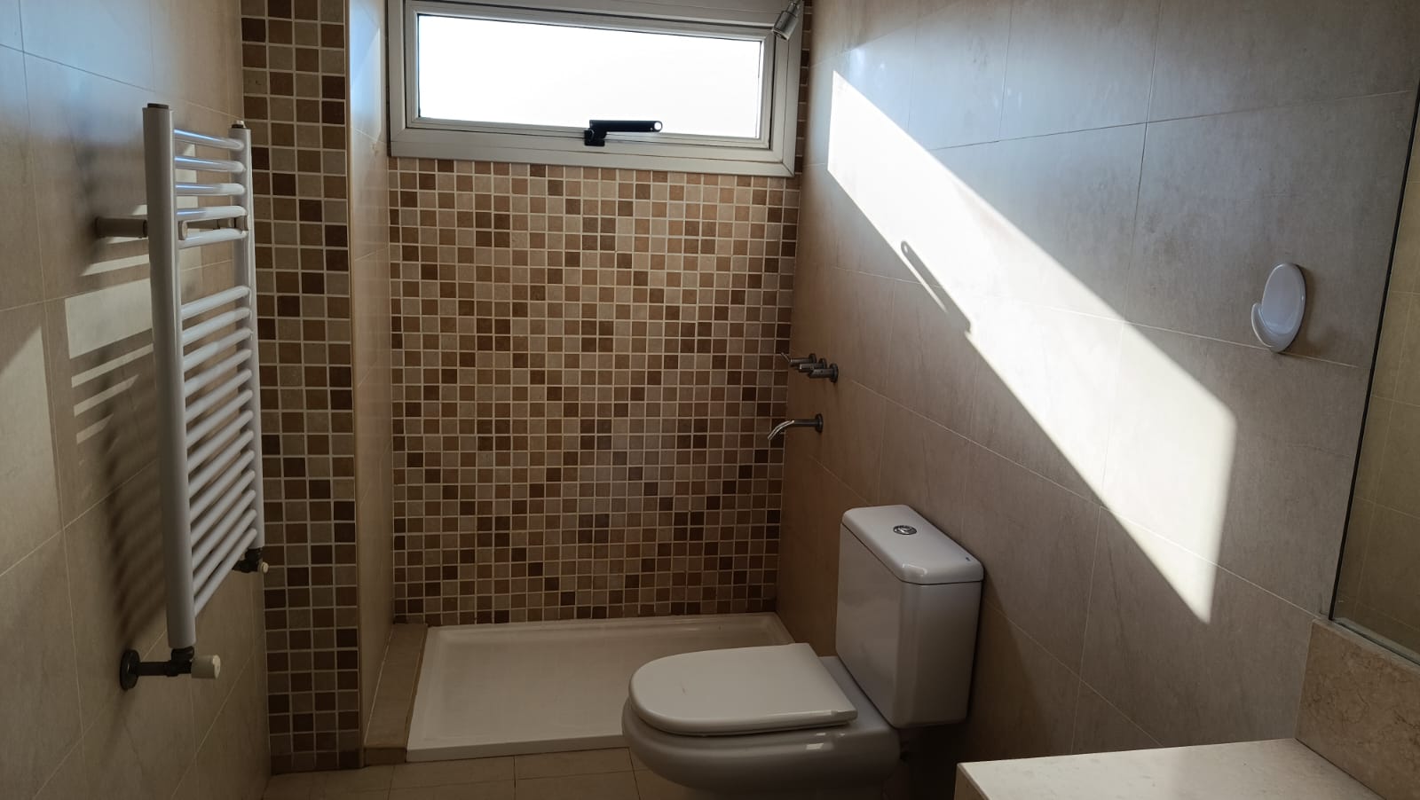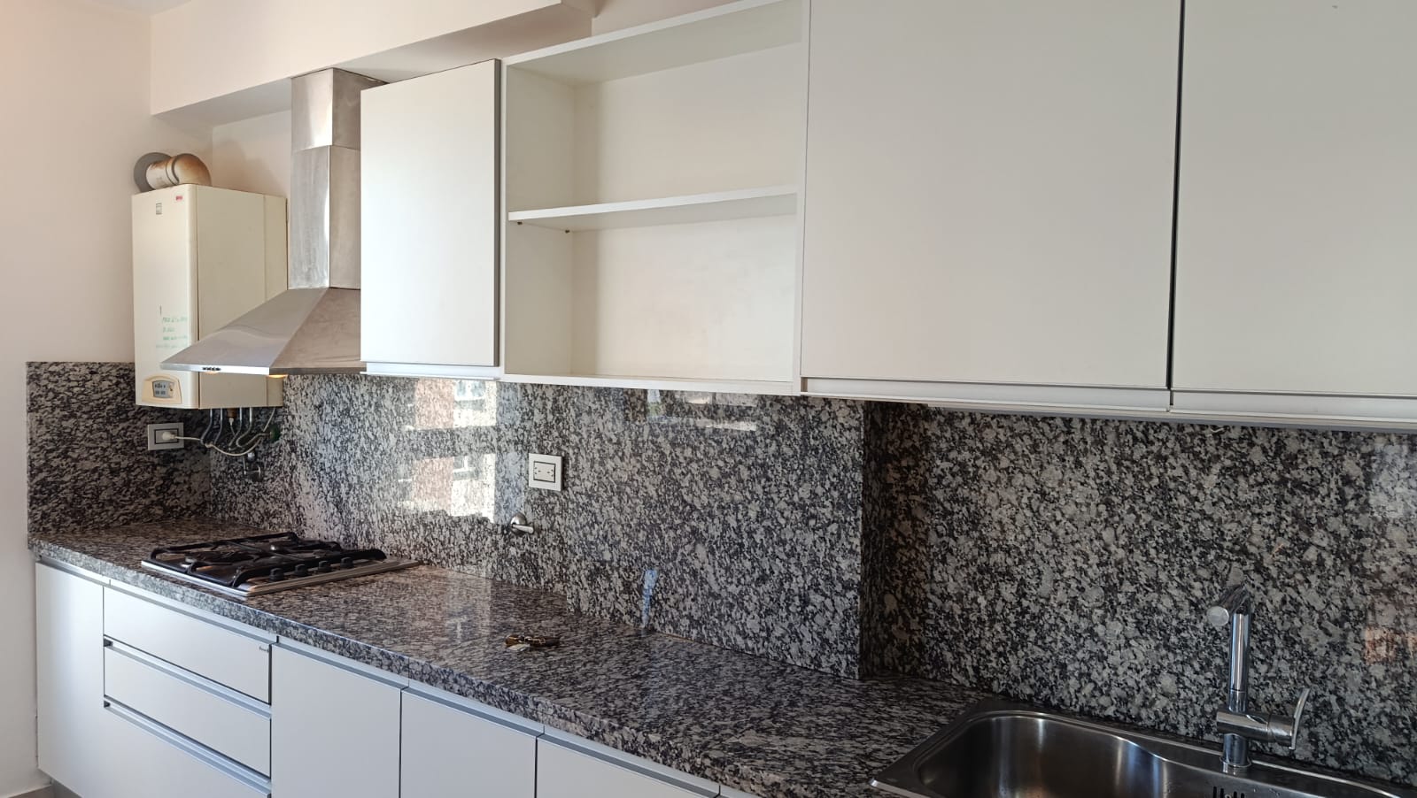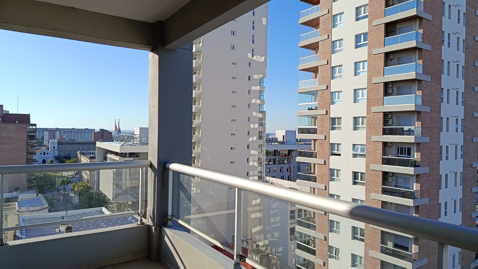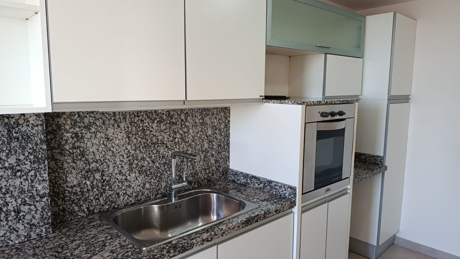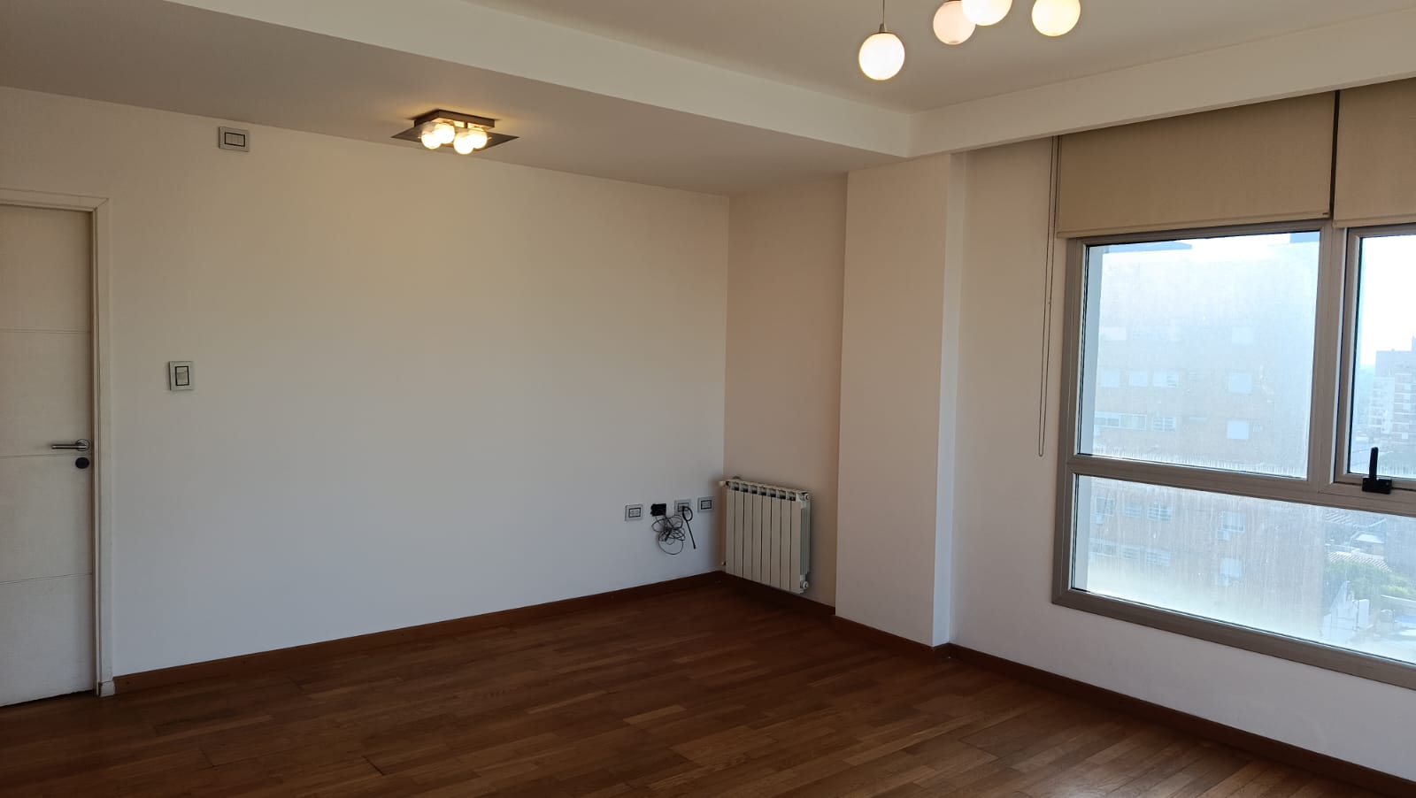 2 dormitorios con placard, (uno en suite) pisos flotantes, uno con acond, cortinas, living-comedor con aire acond, radiadores, cortinas, con balcón al frente, cocina con mesada, alacenas, horno, anafe, 2 baños.